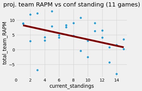 11 games is hardly enough data to verify if these predictions were correct, but we can regress projected RAPM against current conference standing to see if there are any outliers/potential mistakes made: