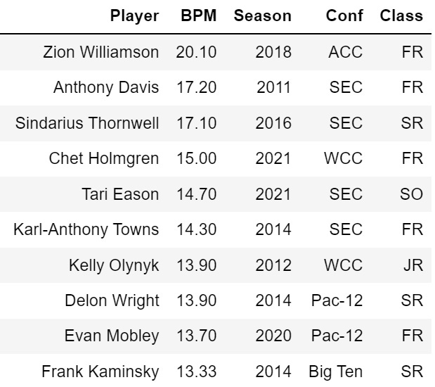 While the freshman prospects ended up becoming the better NBA players, they were not superstars automatically. As expected, some of the better NBA rookies on this list were drafted as upperclassmen. The SEC has also produced some of the highest per-season BPM numbers, but fairly unimpressive NBA rookie numbers, so that could be conference quality in action.