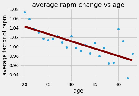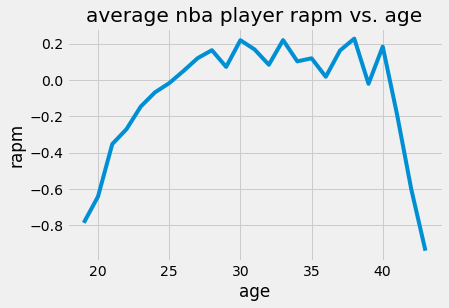 With this tweak we solve for the veteran age factor, or how much we’d expect a player’s RAPM to change with each additional year of age. The age factor is greater than one from age twenty to about age thirty three - in these years, players are, on average, getting better at a declining rate. After thirty-three, however, players get worse at an increasing rate. Around then, the averages end up diverging from the line of best fit a lot, probably due to how few data points there are. We use the line of best fit to solve for our age factors instead, since it fills in the gaps from lack of old-player data:
