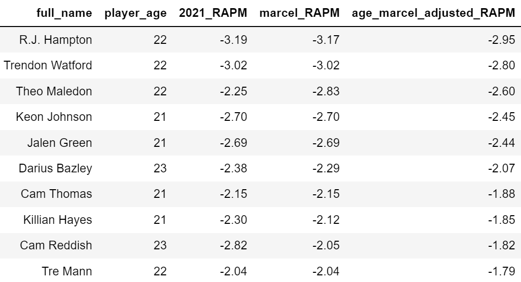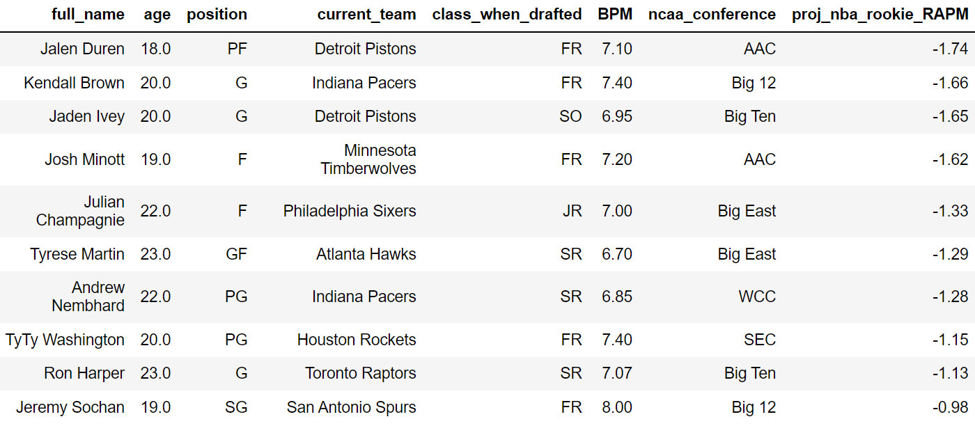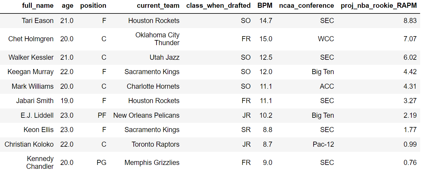 Well, Chet Holmgren is out for the season so this list already has its issues. Holmgren and the rest of the top five spots are all massive outliers. I wouldn’t expect an 8.83 RAPM out of Tari Eason as a rookie (or anyone), but the projections definitely point towards him and his teammate Jabari Smith being impact players immediately for the Rockets.