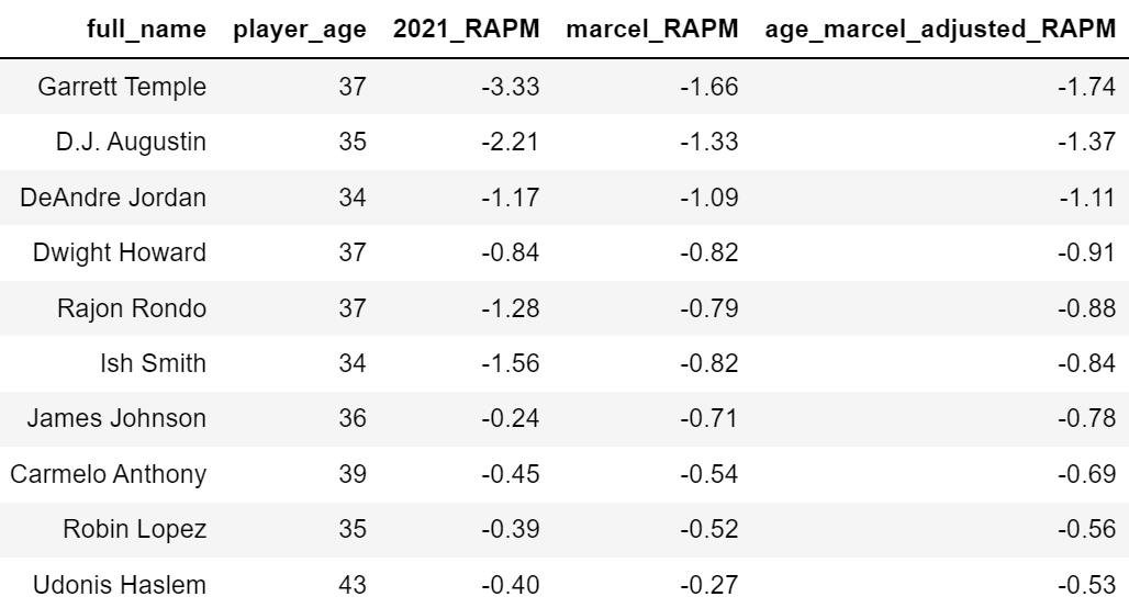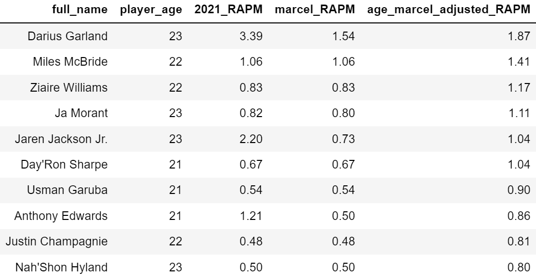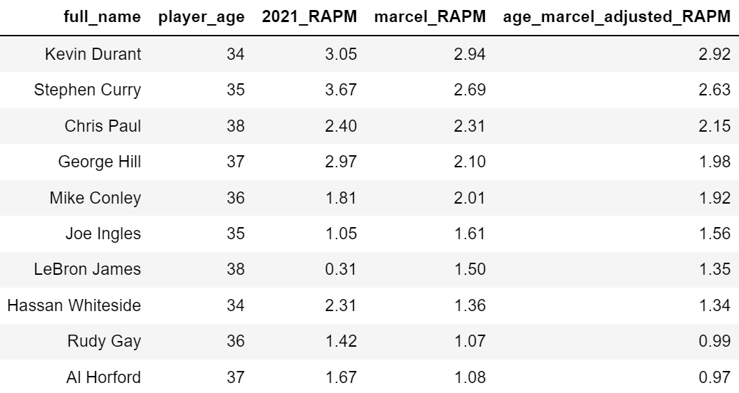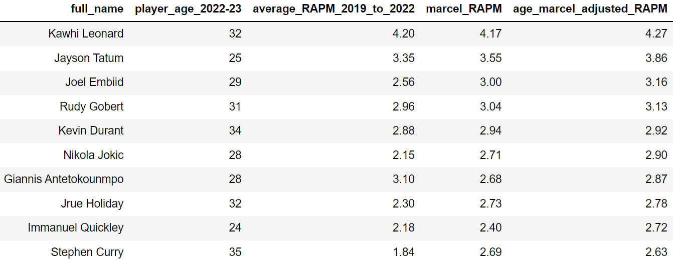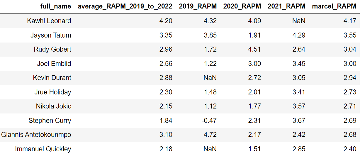Using the Marcel method to project RAPM for veterans, we can penalize players who had their best years behind them, while rewarding players who have been good recently. Players who have been good recently have a Marcel projection which is greater than their three year RAPM average (Tatum, Gobert, Embiid, Durant, Holiday, Jokic, Curry, Quickley). Players who had a down 2021 or 2020 season, relative to prior performance, have lower Marcel projections (Leonard, Antetokounmpo).