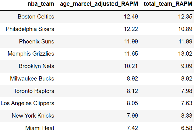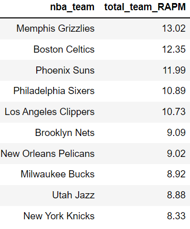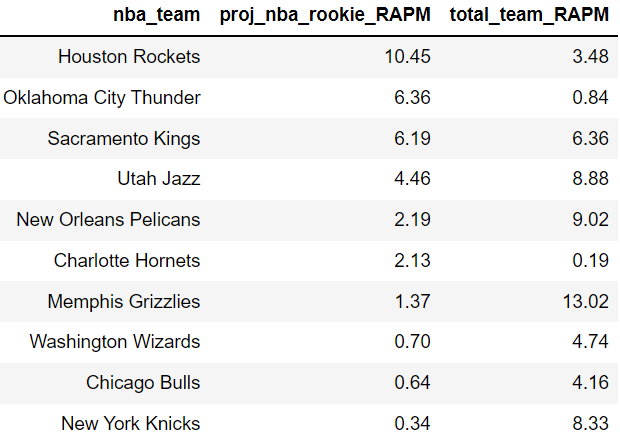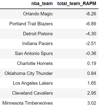 By combining our rookie forecasts with our veteran forecasts, we can look at total team RAPM for 2022-23