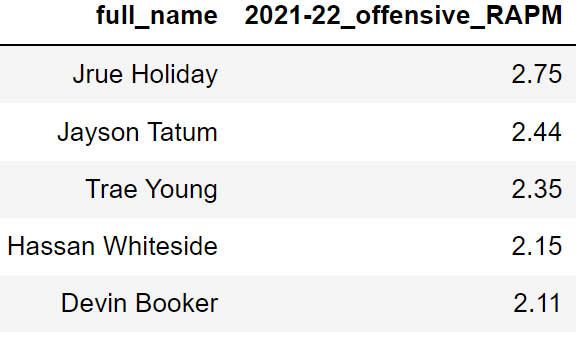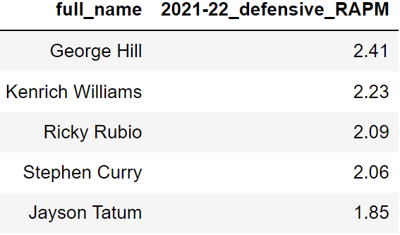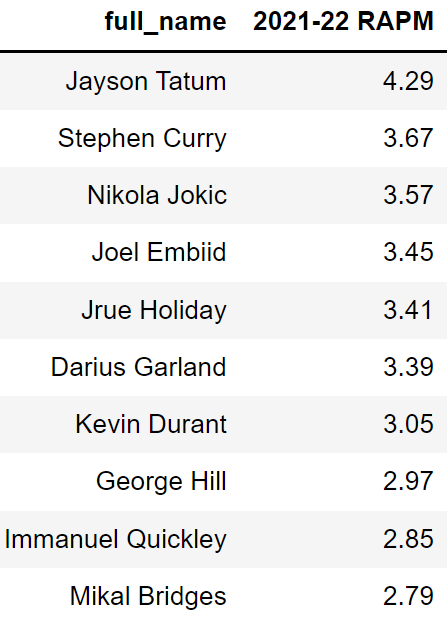 It seems like, according to RAPM, Jayson Tatum was the best player of last season. Nikola Jokic ended up winning the MVP award, however, which is not too egregious considering he was third in total RAPM. Darius Garland was a finalist for Most Improved Player (Ja Morant won), and Mikal Bridges was a finalist for Defensive Player of the Year (Marcus Smart).