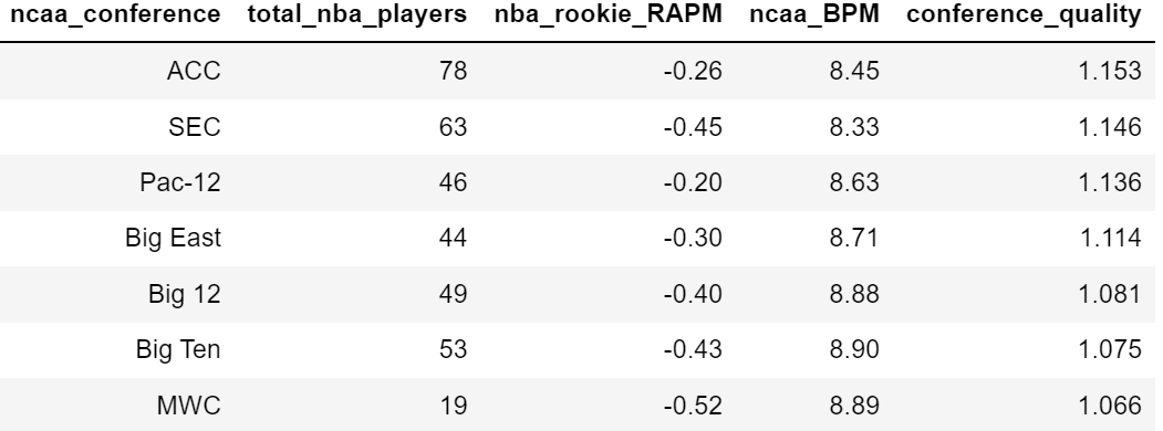 We take all the BPM, conference, and RAPM data to solve for conference quality factors. Here are the results for conferences with greater than fifteen players sent to the NBA in the past decade: