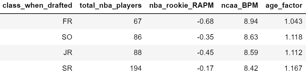 For this we’ll be solving for two constants - draft class age factor and conference quality to control for survivorship bias and strength of opponent, respectively. For the draft class age factor, this will be a factor which controls for a the opposite effect from what we had for veterans - the best NCAA players get drafted before they can have their sophomore, junior, or senior seasons. This age factor also captures how older NCAA players are more “NBA ready” on average - their NCAA BPM correlates more strongly with their rookie-year NBA RAPM. We’d thus expect this factor to be lower for younger players than for older players (while younger players eventually make up the ground with the higher veteran age factor).