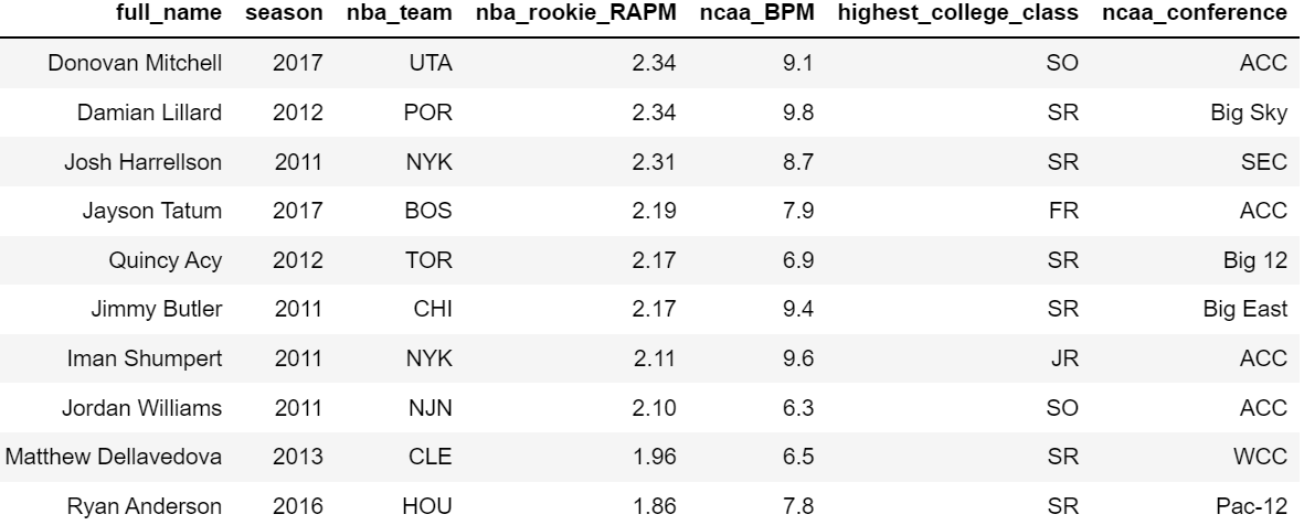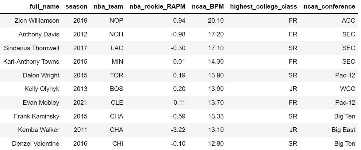 Since RAPM isn’t tracked in the NCAA, box plus-minus (BPM) was created to help NBA teams estimate college players’ values. It is simply the plus/minus for a college player per 100 possessions, not adjusted or regularized. To forecast rookie performance for former NCAA player draftees, we’ll need to create a formula to convert BPM to RAPM.