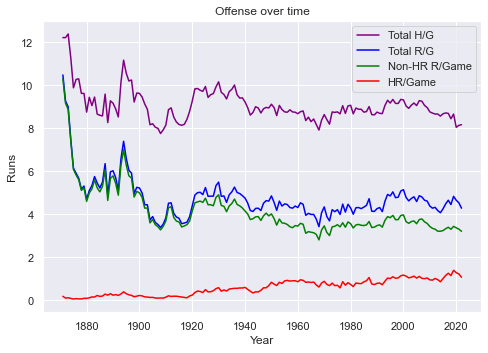 Average production per game has been fairly stable for hits (between 8 and 10) and runs (around 4.5) for most of baseball’s history. We do see, however, how much more integral the home run has become to scoring.