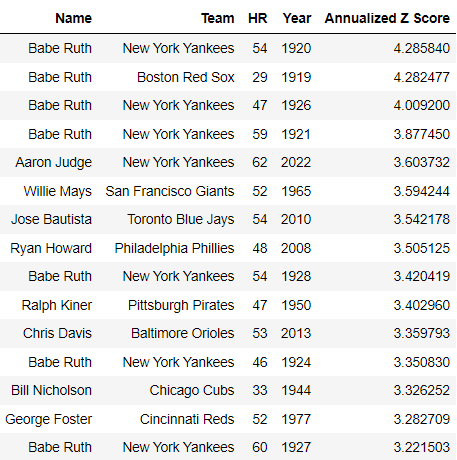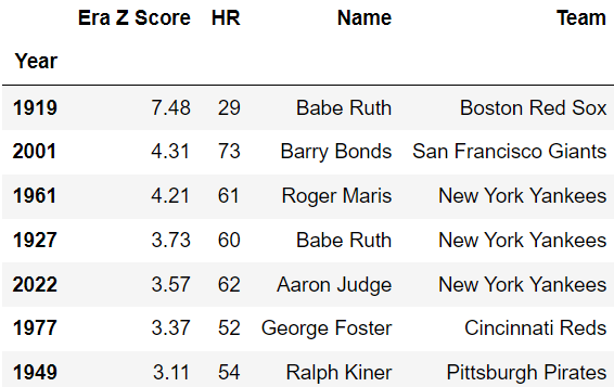 This captures the “outliers” in the above charts - while Barry Bonds’ 73 home run performance in 2001 is the most homers of all time, Babe Ruth’s 1919 season of 29 home runs was just that much further away from his peers in the Dead Ball Era. When you consider Era-specific home run seasons, Babe Ruth’s 1919 season was the best, relative to his peers.