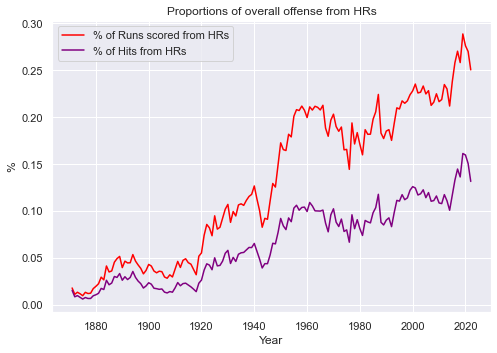 From the rates of home runs over the years in the above chart, we can identify clear regimes - areas of a time series which exhibit/adhere to certain characteristics. We can see, for example that between 1900 and 1920, the proportion of runs due to home runs stays fairly constant around 5%. We see a regime shift - a changing of underlying statistical characteristics around 1920 and then a new regime between 1920 and 1941, and so on and so forth. These regime shifts pretty cleanly map to the seven commonly-used baseball eras - namely the Dead Ball Era, Live Ball Era, Integration Era, Expansion Era, Free Agency Era, Steroid Era, and the post-Steroid Era, which we are in currently.